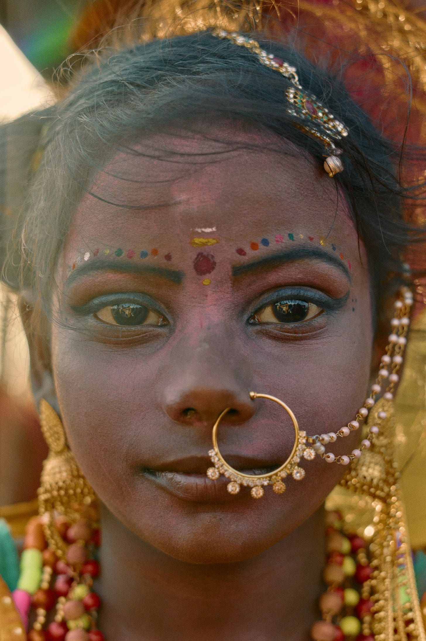 Next, the circles. They appear everywhere: the eyes, the bindi, the jewelry, even in the soft shapes of the makeup. These repeating forms create a sense of rhythm and subtle symmetry that ties everything together. It’s the kind of visual echo that helps an image stand above the archive.