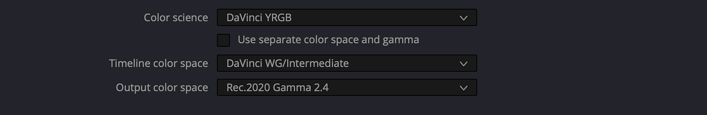 What these settings translates to is that I’ll get to use a very wide colour space to manage colour (DaVinci Wide Gamut) and then export into a space that’s most commonly used for viewing content on the web (Rec.709 Gamma 2.4).