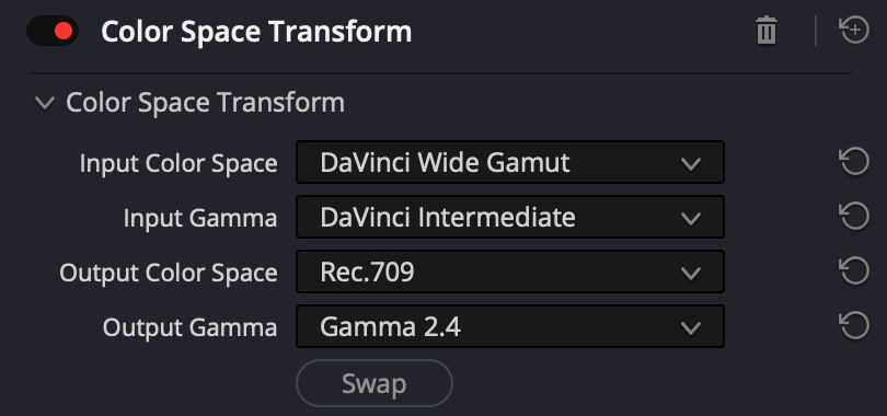 From here, I’ll jump to my last node, which will be a colour transform out to my final format. Here, I’ll have the transform go from DaVinci Wide Gamut into the Rec.709 Gamma 2.4 format for final delivery.